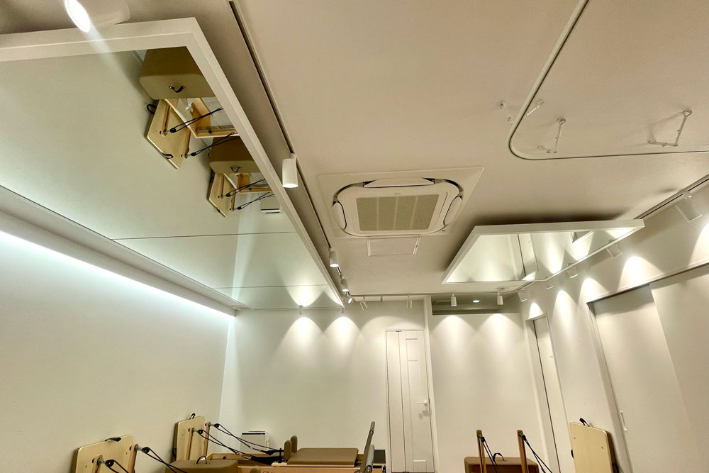 ピラティスミラーは、天井に大きな鏡が張られているのも特徴です。