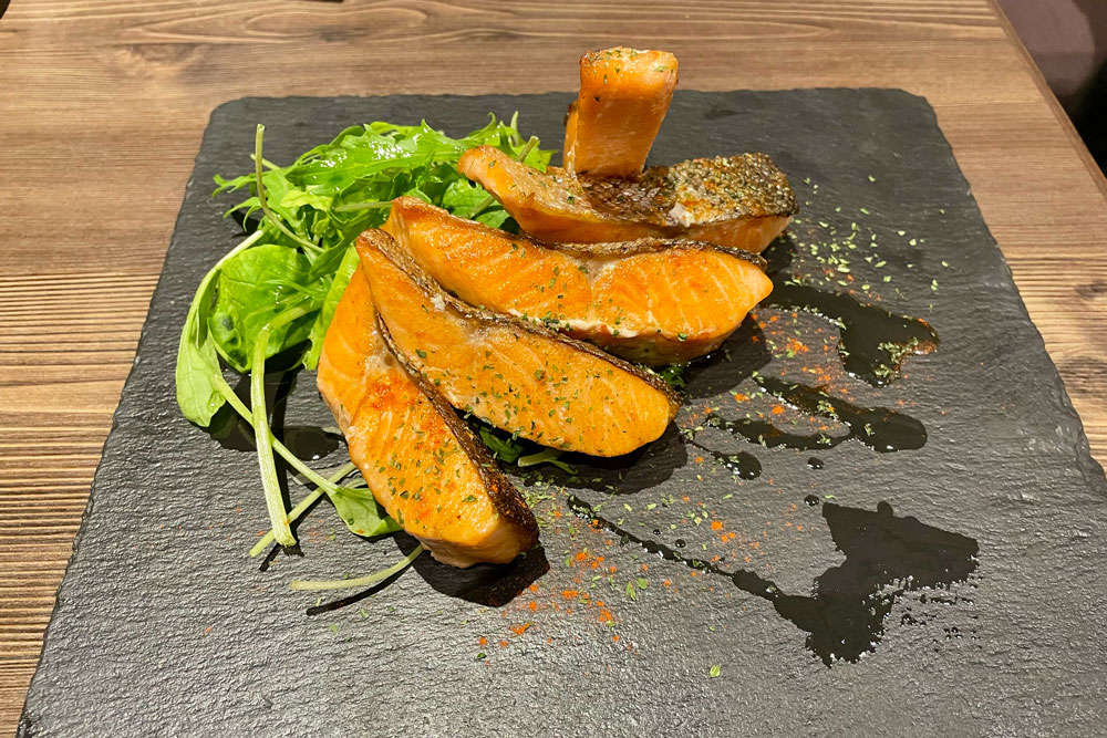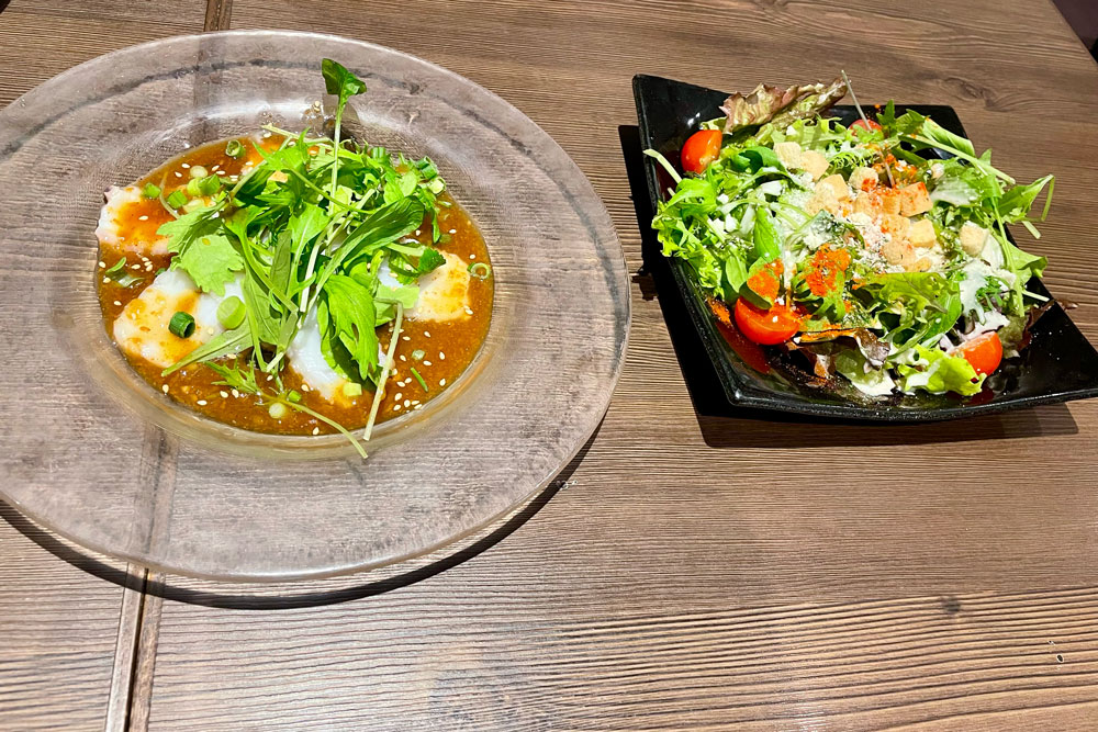 食感が抜群の生タコを香味ドレッシングでいただく生タコの香味カルパッチョや、新鮮な地元野菜を使った生ハムと温泉玉子のシーザーサラダは、日本酒はもちろん洋酒との相性もバッチリです。