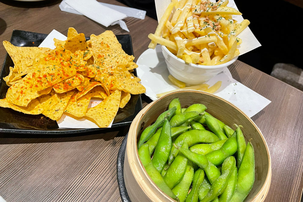 トルティーヤチップスやせいろ蒸し枝茶豆、フライドポテト ガーリックチーズのせは、一度つまみ出したら止まらないやつ。