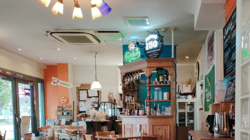 入口にある“OPEN”のネオン看板や緑色のドア、置かれている黒板が海外のカフェテリアのような雰囲気。