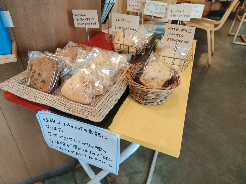 こちらの焼き菓子はテイクアウトもできますし、店内で食べることもできます。店内を利用される場合は、金額が変わりますのでご注意ください。