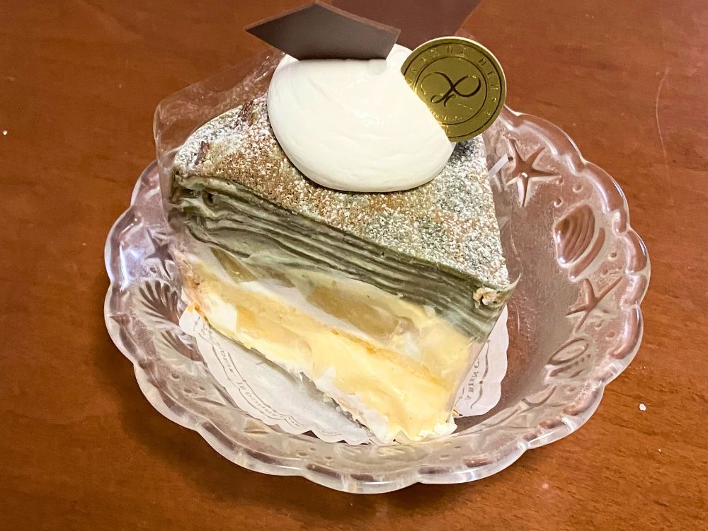 カスタードクリームとりんごを重ねたスポンジ生地の上に、抹茶生地のクレープとクリームを層にした「りんごと抹茶のミルクレープ」。