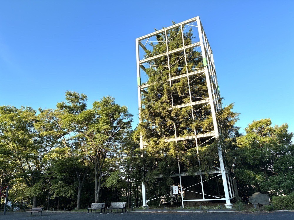 園内には、この公園の名前であり象徴でもある大きな「かやの木」があります。鉄骨で囲まれ大切に守られているその姿からは、地域に根付いた歴史を感じます。