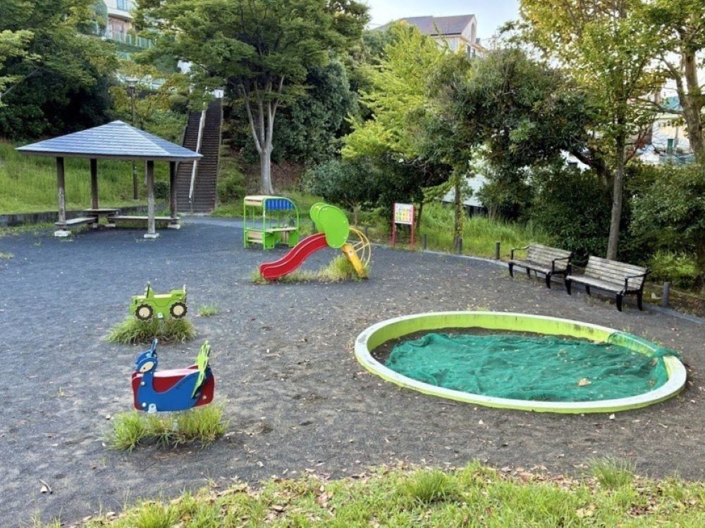 公園の一角には、小さな子ども向けの遊具や砂場があります。私の息子はハンドルが付いている遊具が大好きで、よく運転手さんごっこをして遊んでいました。