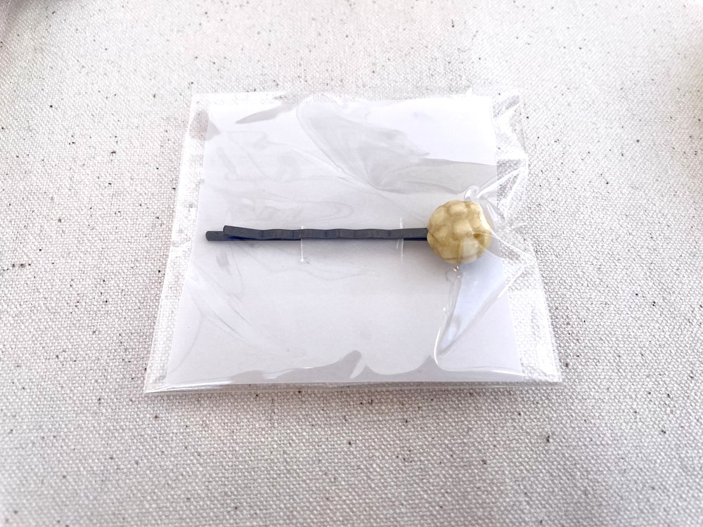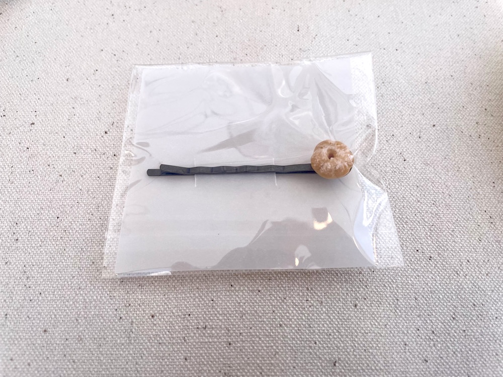 シンプルで小さいヘアピンですが、ミニチュアフードがアクセントになって、思わず目がいきますね。かわいらしくて、子どもだけではなく大人も思わず笑顔になります。