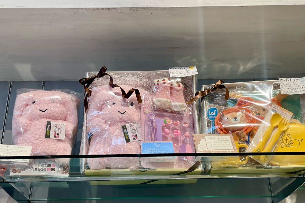 出産祝いに最適なベビーグッズもあります。ライオンは男の子、ピンクのうさぎは女の子向けです。