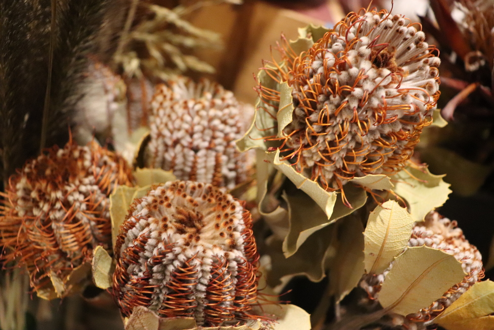 季節の花が咲き誇る中には、少し珍しい形をしたバンクシア コクシニアなど、個性的な花の姿も。見ているだけで心が弾んできます。