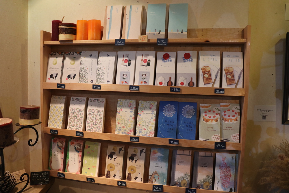 棚いっぱいに並ぶデザインはどれもおしゃれでかわいらしく、思わず手に取りたくなります。派手すぎず、落ち着いた色合いと上品なイラストが印象的で、お花と一緒に贈ったら喜ばれること間違いなしです。