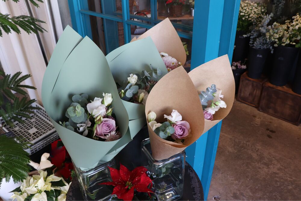 店内には、気軽に手に取りやすい小さな花束も並んでいます。ちょっとしたプレゼントや、自分用に花を楽しみたいときにも選びやすいサイズ感です。