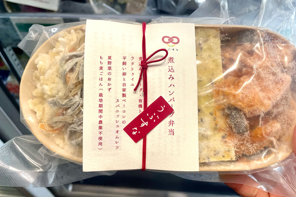 季節のソースで味わう、野菜の旨味たっぷりでジューシーな「煮込みハンバーグ弁当」。