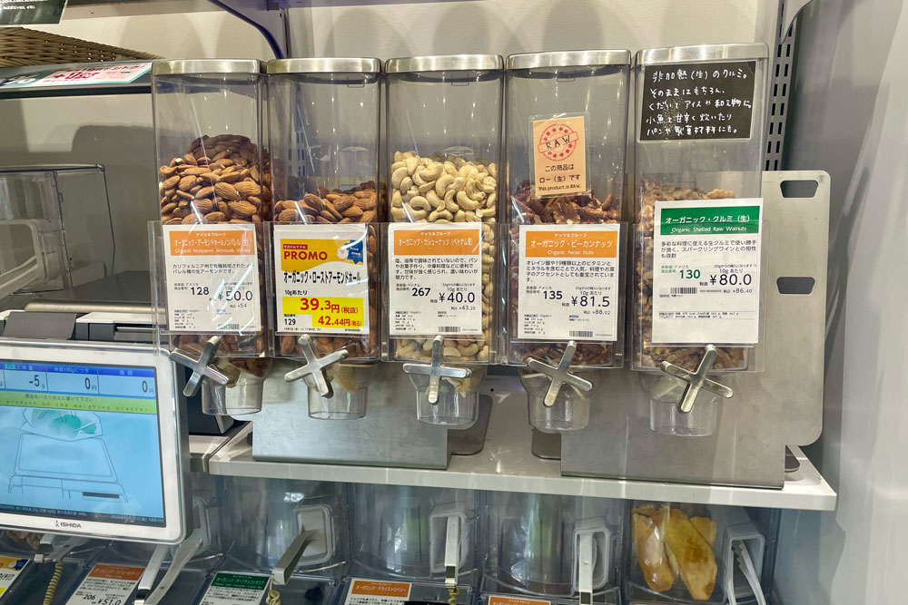 ナッツやドライフルーツなどは、量り売りのものがあります。オーガニックのカシューナッツやロー(生)のビーガンナッツ、くるみ、アーモンドなど種類も豊富。