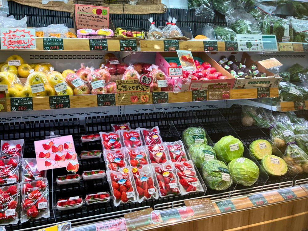 いちごや柑橘類などの季節の果物や野菜が並んでいます。