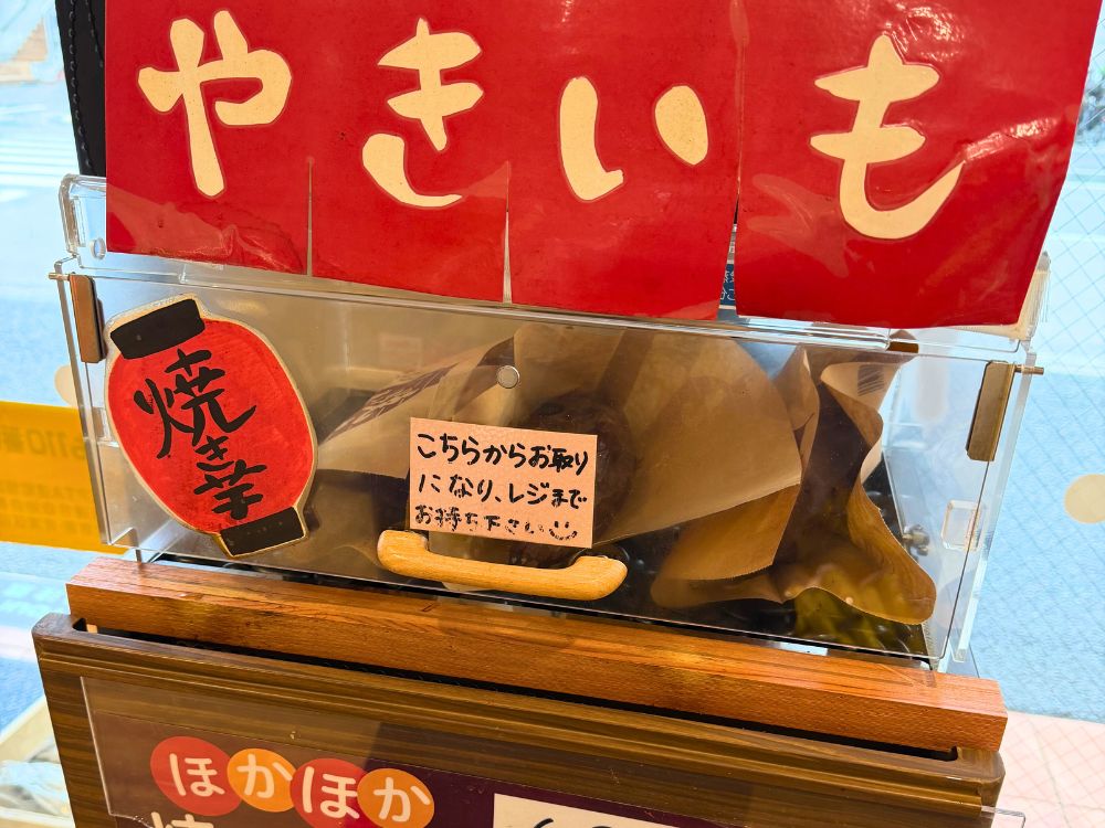 店内には焼き芋の香ばしい香りが広がり、温かい焼き芋を購入することもできます。日によって種類が変わるため、その日の味わいを楽しめるのも魅力です。
