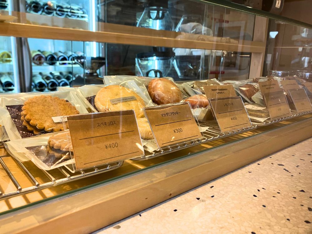 素材にこだわったクッキーやチョコレートが整然と並び、上品ながらも温かみのある空間が広がります。