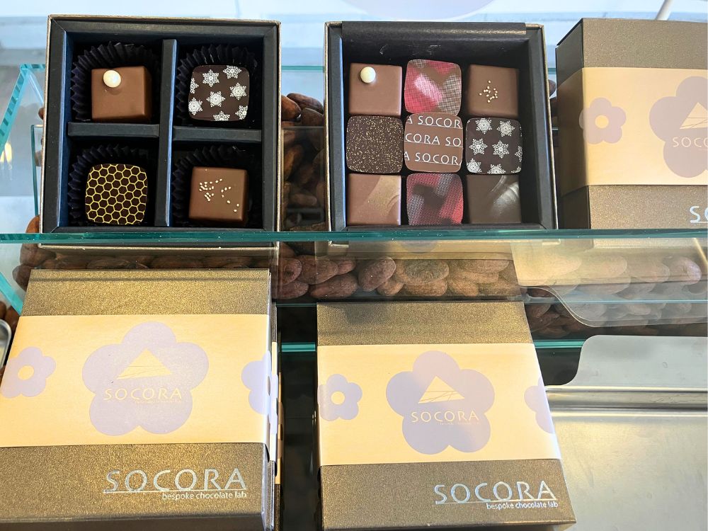 姉妹店ソコラのチョコレートのラインナップも用意。定番のボンボンショコラやオランジェット、子どもに人気のキッズショコラ。