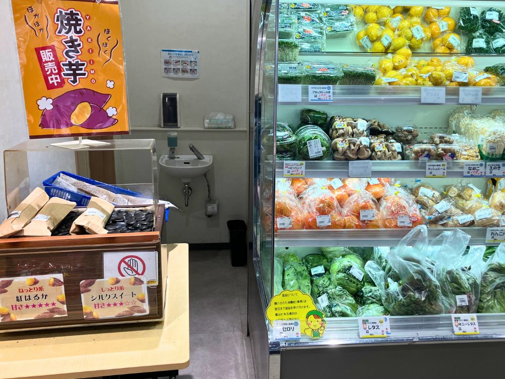 秋から春にかけて焼き芋を販売。その日のおすすめ品種が並ぶため、さつまいもの種類ごとの甘さや食感の違いを楽しめます。