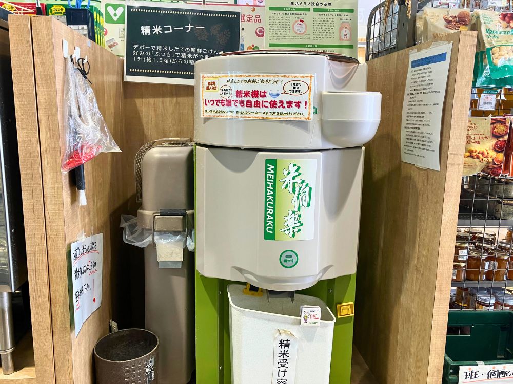 店内には精米機が設置されており、デポーで購入したお米を、その場で白米から分づき米まで好みに合わせて精米できます。米ぬかを持ち帰れるのもうれしいポイントです。