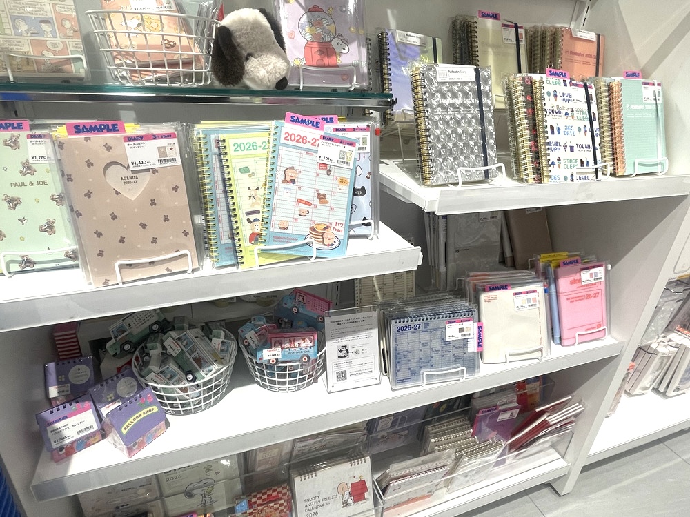手帳やミニノートなどの文房具の種類も豊富。サンプルを手に取れるので、中のデザインもチェックできます。